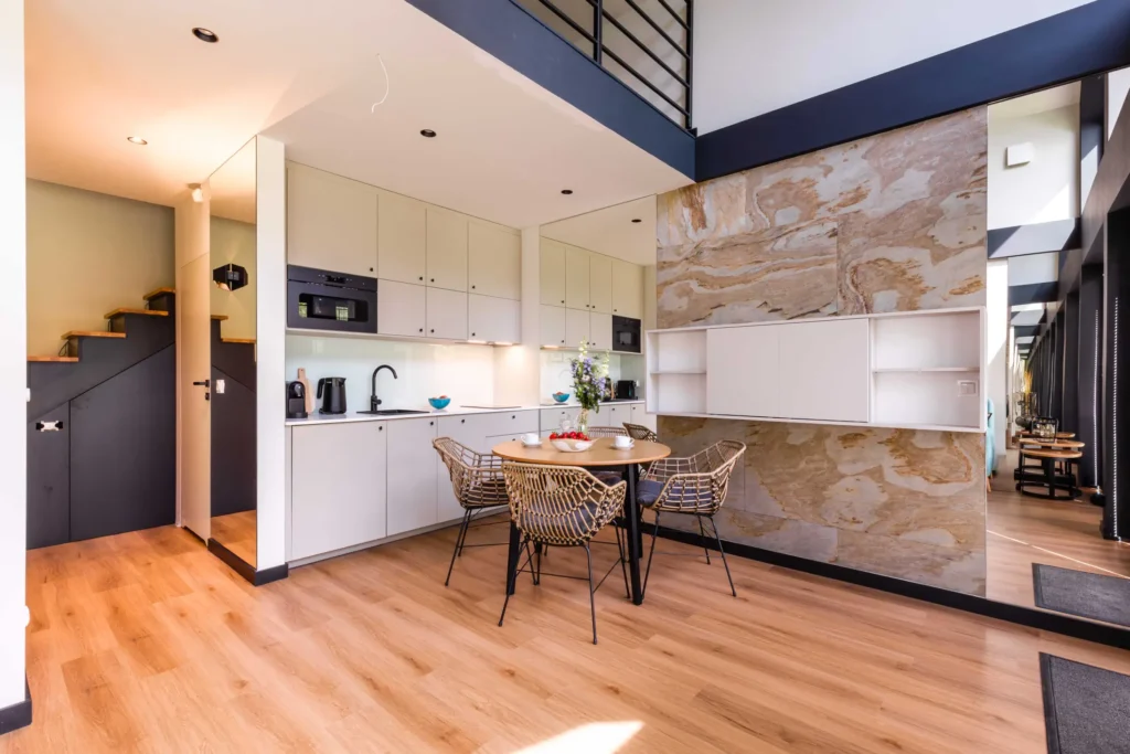 Wchodząc do środka, od razu poczujesz różnicę. Jasne, klimatyczne wnętrza zaprojektowane przez naszą przyjaciółkę – architektkę łączą nowoczesny komfort z naturalną harmonią. Parter to otwarta przestrzeń, gdzie salon płynnie przechodzi w pełni wyposażoną kuchnię – idealne miejsce na wspólne gotowanie porannych śniadań czy wieczornych kolacji przy lampce wina.