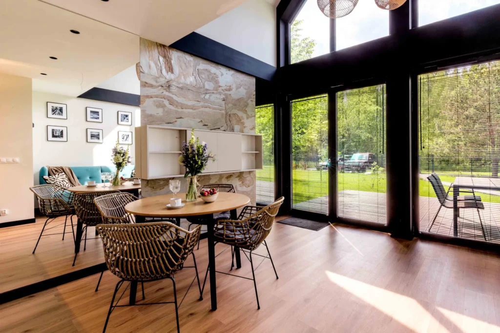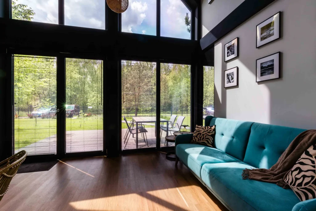 Domek Słoneczny to prawdziwa perła Forest View – miejsce stworzone dla tych, którzy kochają naturalne światło i energię płynącą z promieni słońca. Ten przestronny domek typu stodoła został strategicznie usytuowany, by przez cały dzień łapać słoneczne promienie, tworząc wnętrza pełne ciepła i pozytywnej energii.